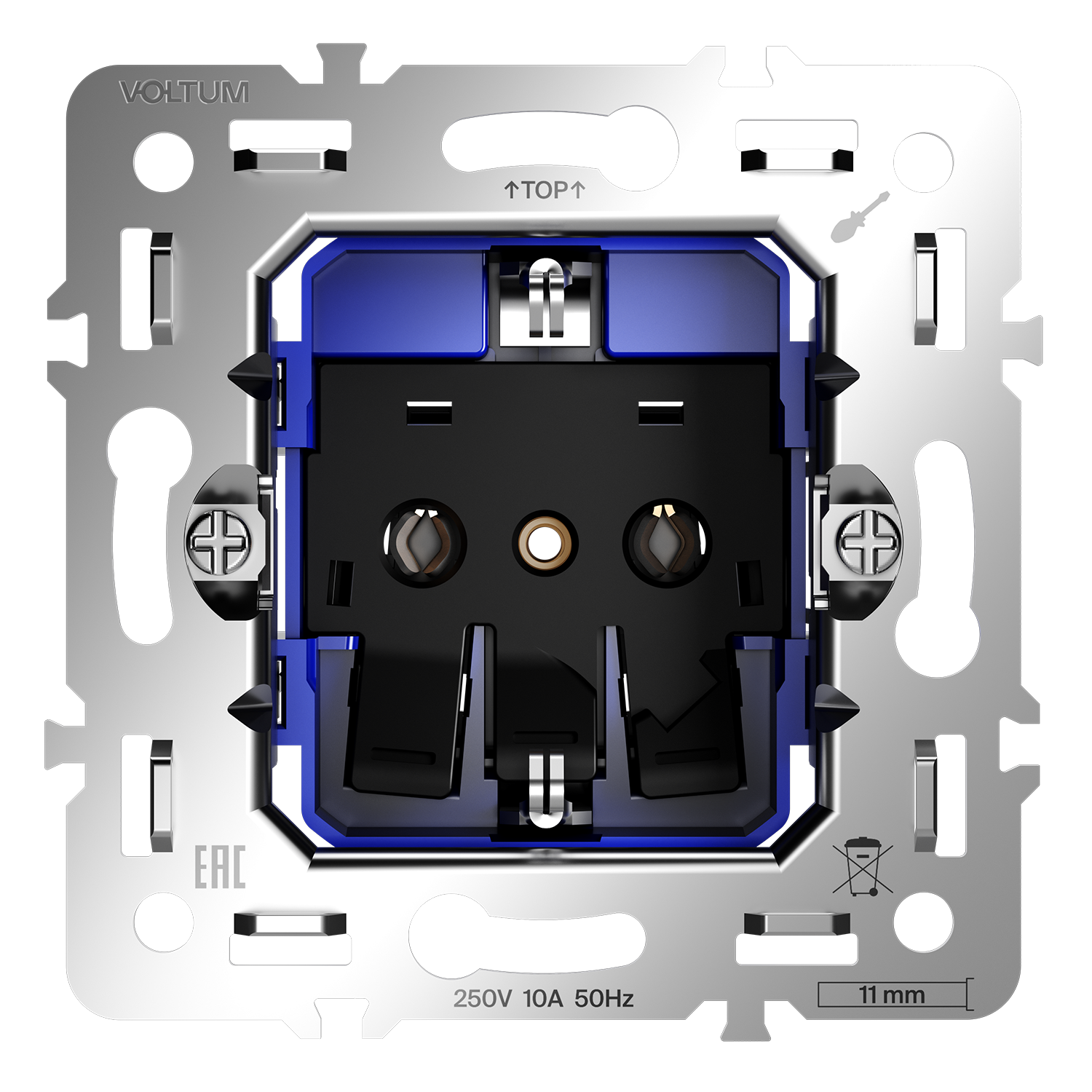 Механизм розетки Voltum S70 рассчитан на номинальный ток 16 А и напряжение AC 220-240 V 50 Hz. Частота сети питания составляет 50 Гц. Изделие выполнено из металла, что обеспечивает прочность и долговечность. Подключаемые провода могут иметь сечение от 0.75 до 2.5 мм². Класс защиты IP 20 позволяет использовать розетку в помещениях с нормальной влажностью. Температура эксплуатации варьируется от 0°С до 60 °С. Габариты изделия составляют 73.8 мм в длину и ширину, с монтажной глубиной 31.5 мм. Вес брутто — 0.079 кг, вес нетто — 0.06 кг. На розетку предоставляется гарантия 2 года.
