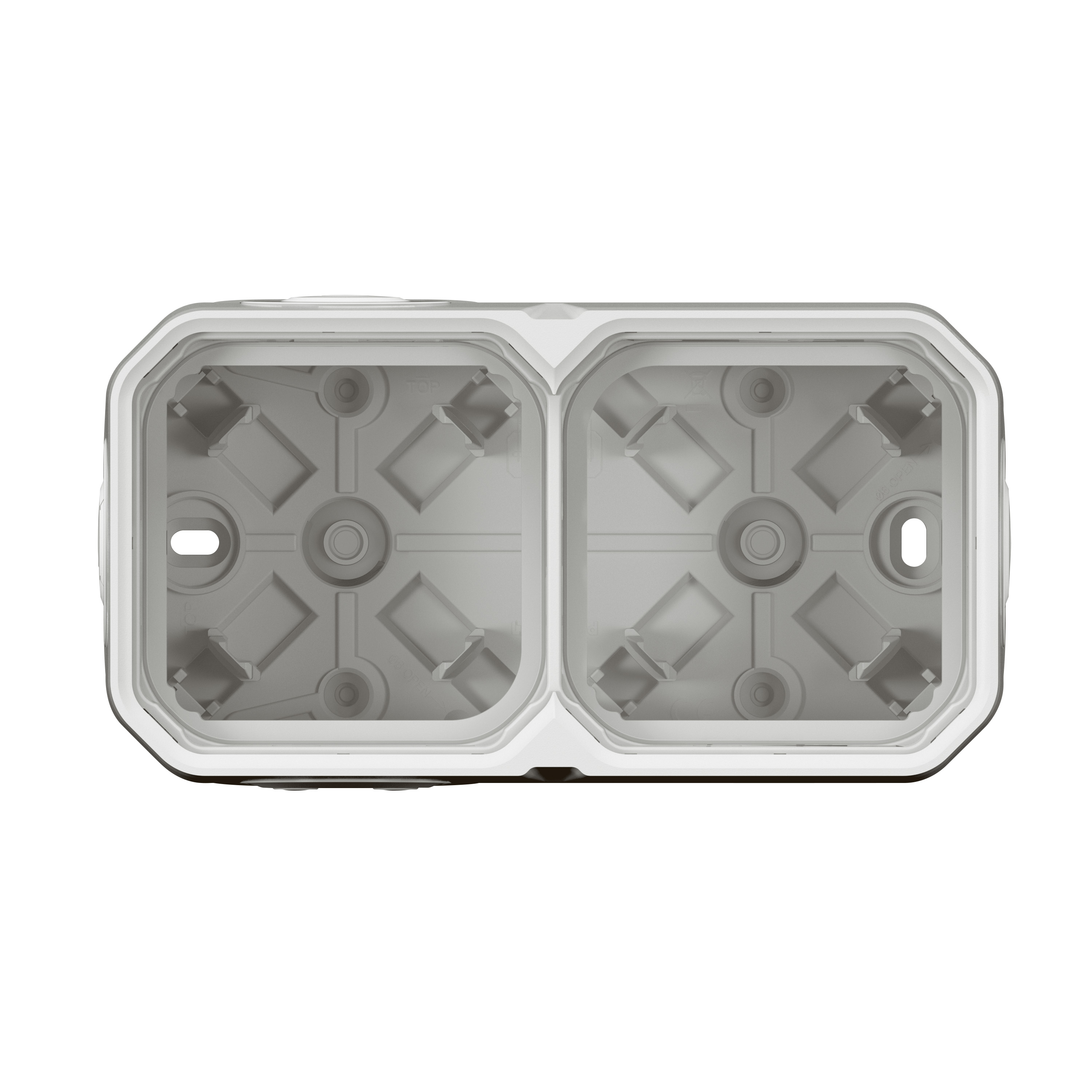 Водонепроницаемый накладной корпус LEGRAND Plexo (артикул 069690L) предназначен для установки двух горизонтальных или вертикальных механизмов на поверхности. Корпус выполнен в белом цвете и обладает герметичностью IP55, что защищает подключенные устройства от пыли и воды, обеспечивая надежную эксплуатацию в любых влажных помещениях.